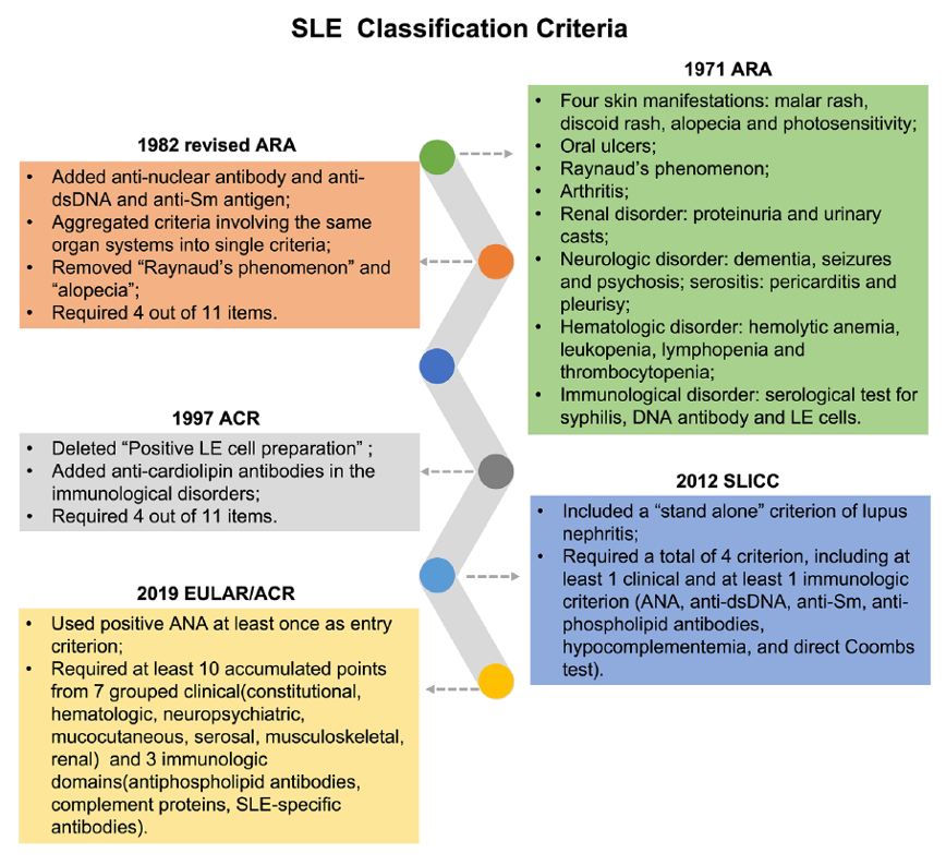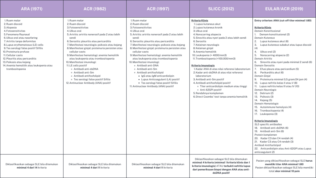Kriteria klasifikasi SLE berkembang sesuai dengan semakin banyaknya ilmu yang diketahui mengenai SLE. Kriteria klasifikasi SLE pertama kali diperkenalkan oleh American Rheumatism Association (ARA) pada tahun 1971. Kriteria ini meliputi empat manifestasi kulit (ruam malar, ruam discoid, alopesia, fotosensitivitas), ulkus mulut, fenomena Raynaud, arthritis, kelainan ginjal, kelainan neurologis, serositis, kelainan hematologi, dan kelainan imunologi. Jika ditemukan adanya 4 dari 14 kriteria, pasien diklasifikasikan sebagai definite SLE. Kriteria tersebut menjadi dasar klasifikasi pasien lupus dan telah diterapkan dalam banyak penelitian klinis sejak saat itu.