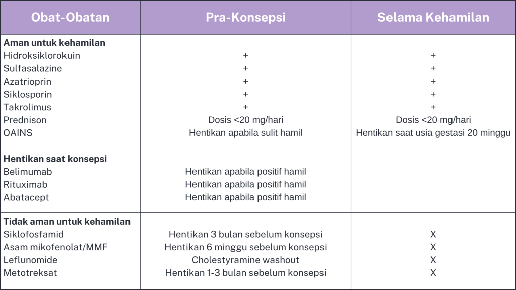 Metotreksat, leflunomide, mikofenolat mofetil, dan siklofosfamid harus dihentikan sebelum kehamilan karena terbukti bersifat teratogenik, dan tidak boleh digunakan selama menyusui. Leflunomide memiliki waktu paruh yang panjang pada tubuh, sehingga wanita yang berencana untuk hamil dengan riwayat konsumsi leflunomide perlu melakukan prosedur eliminasi obat dengan kolestiramin sebelum konsepsi. Mikofenolat mofetil terbukti menyebabkan malformasi kongenital dan abortus spontan, sehingga penggunaannya harus dihentikan sebelum hamil. Penjelasan mengenai keamanan obat-obatan untuk tatalaksana SLE pada kehamilan dapat dilihat pada tabel berikut ini.